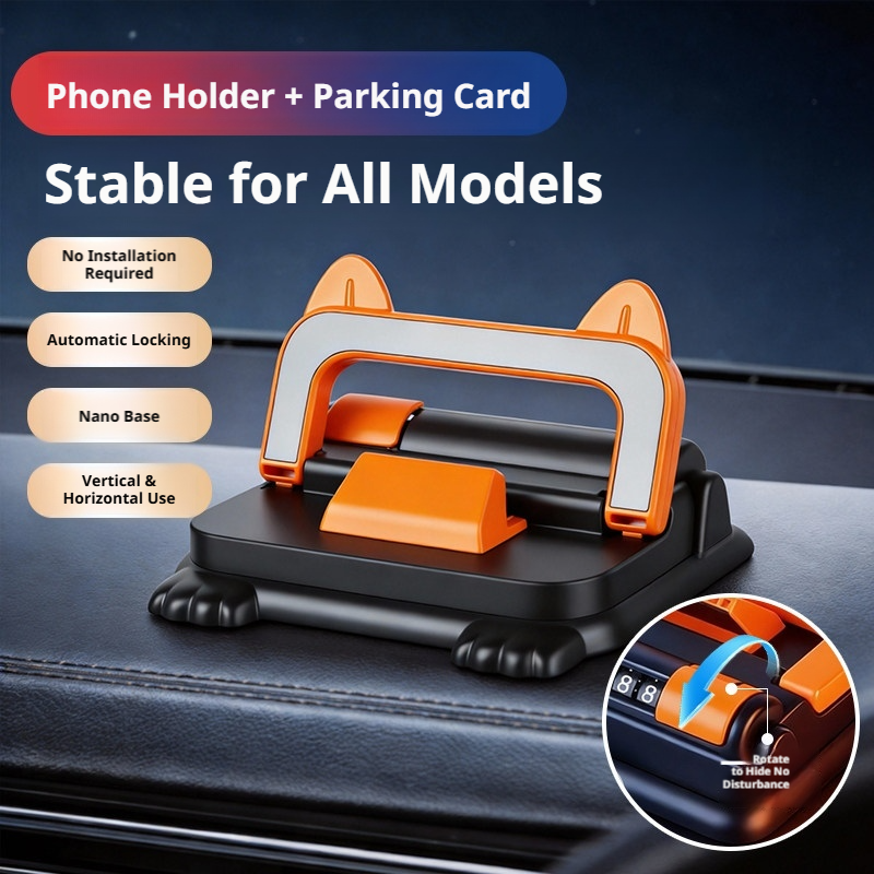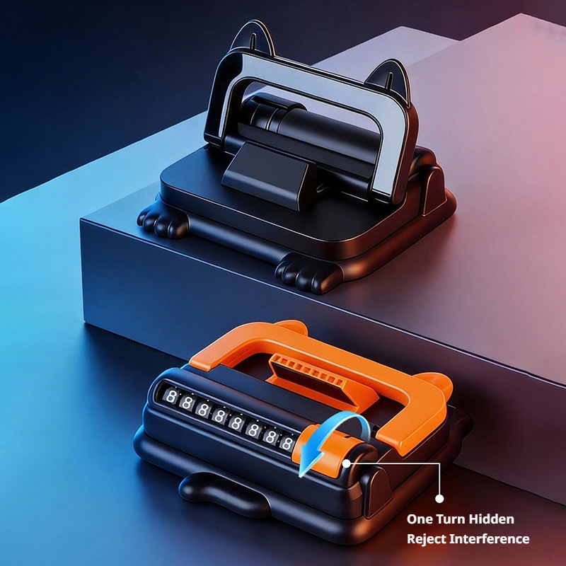 Combines phone holder and parking number display in a single space-saving design. The flip mechanism allows seamless transition between functions, optimizing dashboard organization while maintaining accessibility.